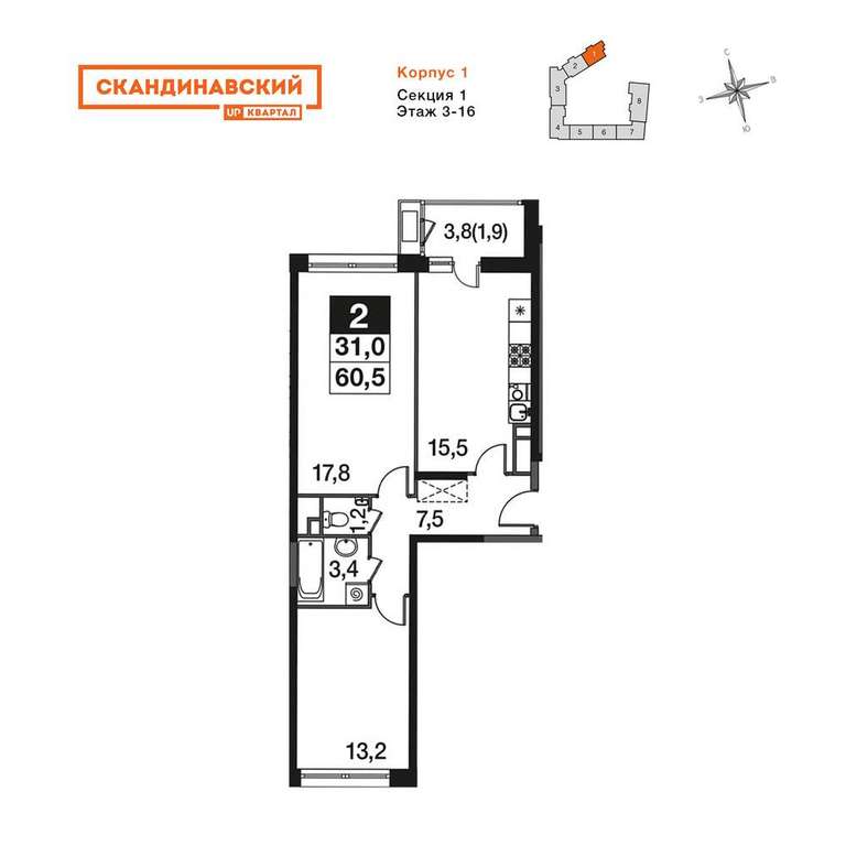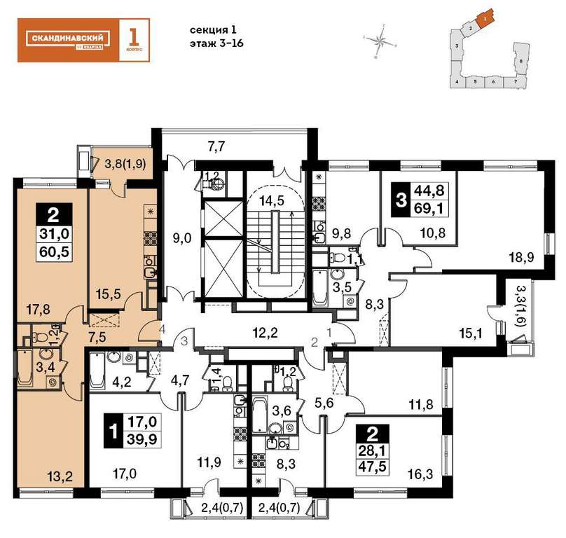 Продаётся 2-к квартира номер 8 общей площадью 60.5 кв. м. на 3-м этаже 16 этажного дома. Без отделки.