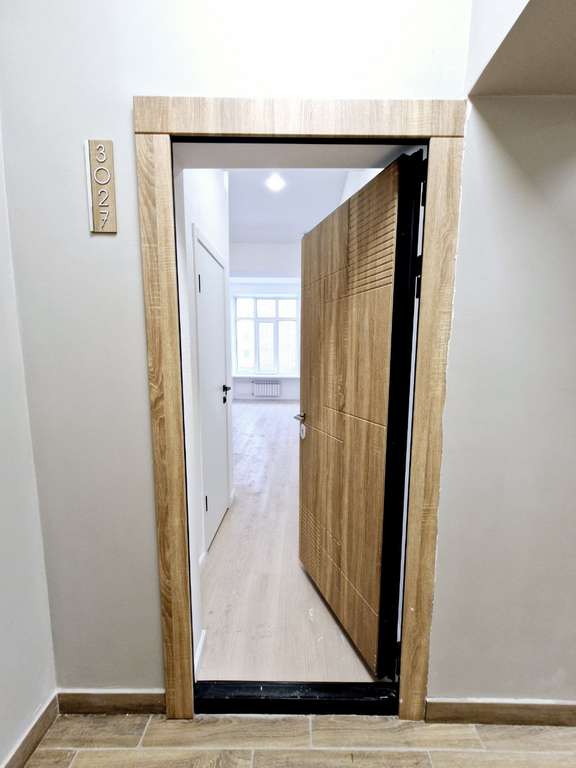 На стенах поклеены обои под покраску, на полу постелен ламинат с плинтусами и откосами. Есть вытяжная вентиляция в санузле и на кухне, выходы хв/гв, место под раковину на кухне. Кроме того, в помещениях уже есть выключатели освещения, розетки для бытовой техники и роутера, а также сделаны закладные для оптоволокна для интернета.