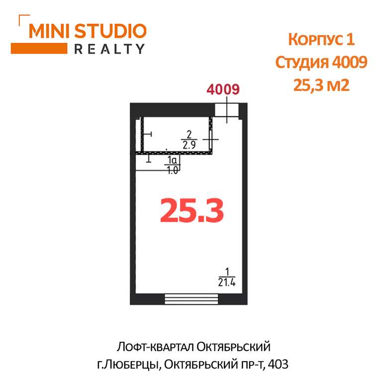 Просторная студия 25,2 кв. м в подмосковном городе Люберцы. Собственная огороженная охраняемая территория с парковкой