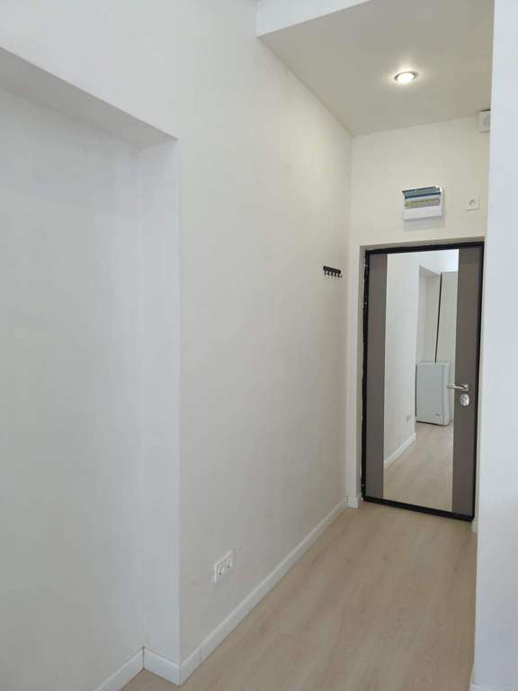 На стенах поклеены обои под покраску, на полу постелен ламинат с плинтусами и откосами. Есть вытяжная вентиляция в санузле и на кухне, выходы хв/гв, место под раковину на кухне. Кроме того, в помещениях уже есть выключатели освещения, розетки для бытовой техники и роутера, а также сделаны закладные для оптоволокна для интернета.