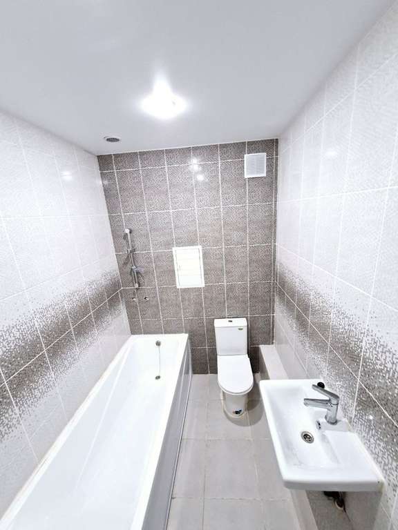 На стенах поклеены обои под покраску, на полу постелен ламинат с плинтусами и откосами. Есть вытяжная вентиляция в санузле и на кухне, выходы хв/гв, место под раковину на кухне. Кроме того, в помещениях уже есть выключатели освещения, розетки для бытовой техники и роутера, а также сделаны закладные для оптоволокна для интернета.