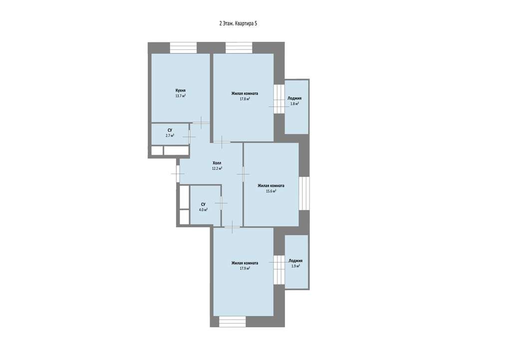 Квартира расположена на втором этаже пятиэтажного дома и имеет жилую площадь 51.3 квадратных метров и кухню площадью 13.6 квадратных метров. Благодаря двум балконам открывается приятный вид как на тихий двор, так и на улицу.