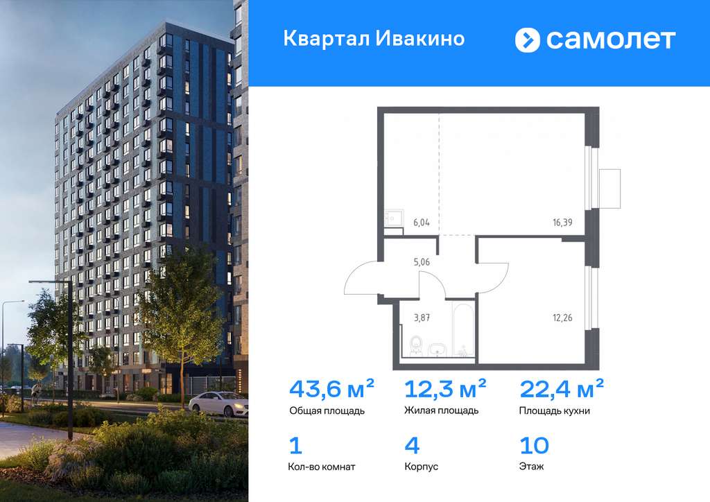 Строим кварталы для жизни с заботой о будущем. Предлагается 1-комнатная квартира комфорт-класса 43,62 кв. м в корпусе 4 на 10 этаже, в ЖК «Квартал Ивакино»