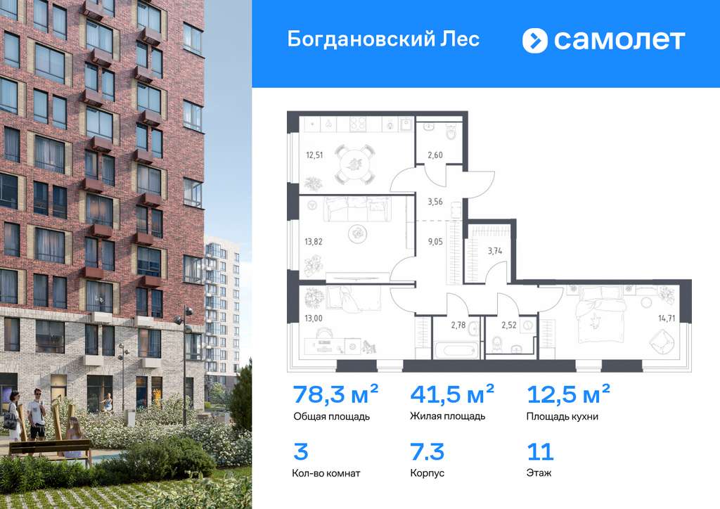 Строим кварталы для жизни с заботой о будущем. Предлагается 3-комнатная квартира комфорт-класса 78,29 кв. м в корпусе 7.3 на 11 этаже, в ЖК «Богдановский Лес»