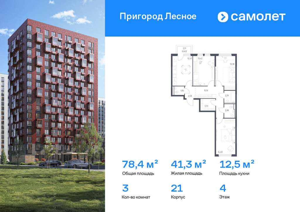 Строим кварталы для жизни с заботой о будущем. Предлагается 3-комнатная квартира комфорт-класса 78,36 кв. м в корпусе 21 на 4 этаже, в ЖК «Пригород Лесное»