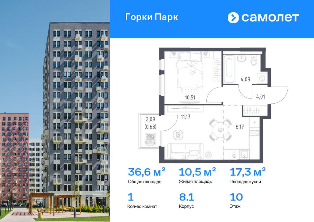 Строим кварталы для жизни с заботой о будущем. Предлагается 1-комнатная квартира комфорт-класса 36,58 кв. м в корпусе 8.1 на 10 этаже, в ЖК «Горки Парк»