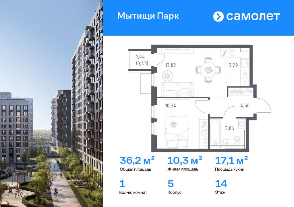 Строим кварталы для жизни с заботой о будущем. Предлагается 1-комнатная квартира комфорт-класса 36,24 кв. м в корпусе 5 на 14 этаже, в ЖК «Мытищи Парк»