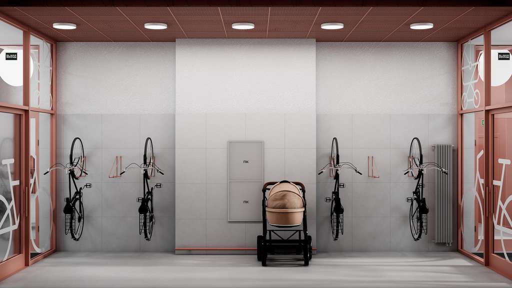 Все подъезды — с безбарьерным входом. В лобби есть помещения для велосипедов и колясок. На техническом этаже — индивидуальные кладовые для сезонных вещей.