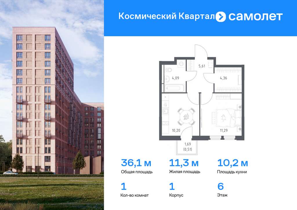 Строим кварталы для жизни с заботой о будущем. Предлагается 1-комнатная квартира комфорт-класса 36,06 кв. м в корпусе 1 на 6 этаже, в ЖК «Космический Квартал»