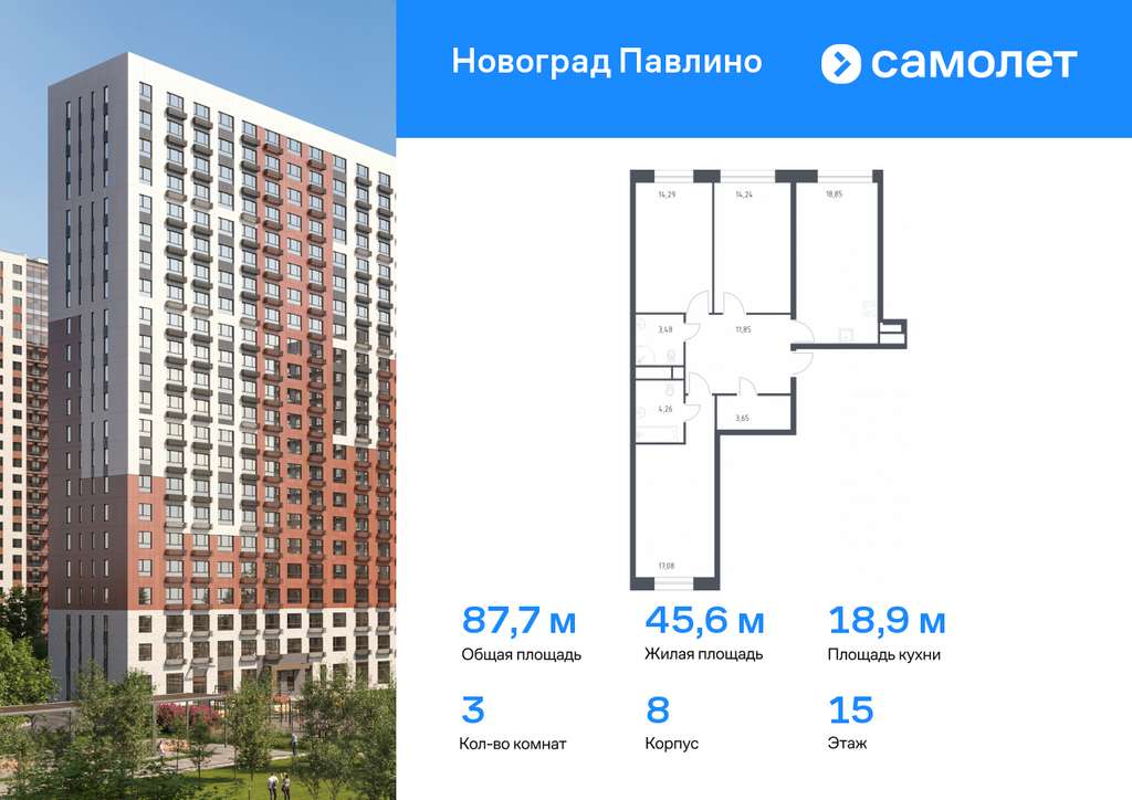 Строим кварталы для жизни с заботой о будущем. Предлагается 3-комнатная квартира комфорт-класса 89,1 кв. м в корпусе 8 на 15 этаже, в ЖК «Новоград Павлино»