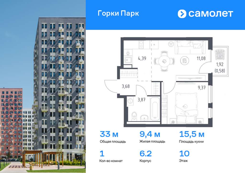 Строим кварталы для жизни с заботой о будущем. Предлагается 1-комнатная квартира комфорт-класса 32,97 кв. м в корпусе 6.2 на 10 этаже, в ЖК «Горки Парк»