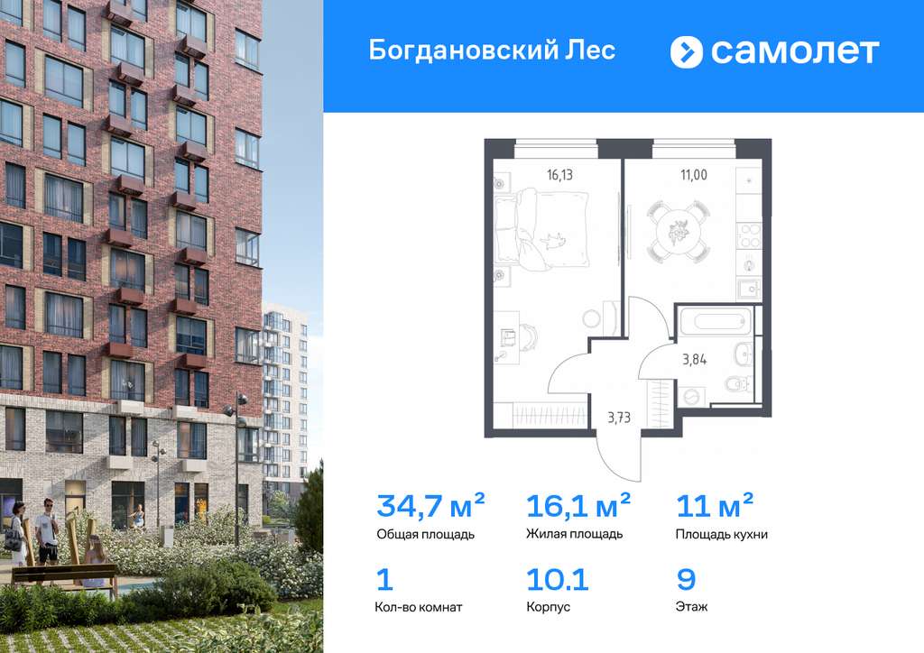 Строим кварталы для жизни с заботой о будущем. Предлагается 1-комнатная квартира комфорт-класса 34,7 кв. м в корпусе 10.1 на 9 этаже, в ЖК «Богдановский Лес»