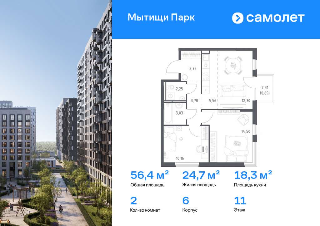 Строим кварталы для жизни с заботой о будущем. Предлагается 2-комнатная квартира комфорт-класса 56,42 кв. м в корпусе 6 на 11 этаже, в ЖК «Мытищи Парк»