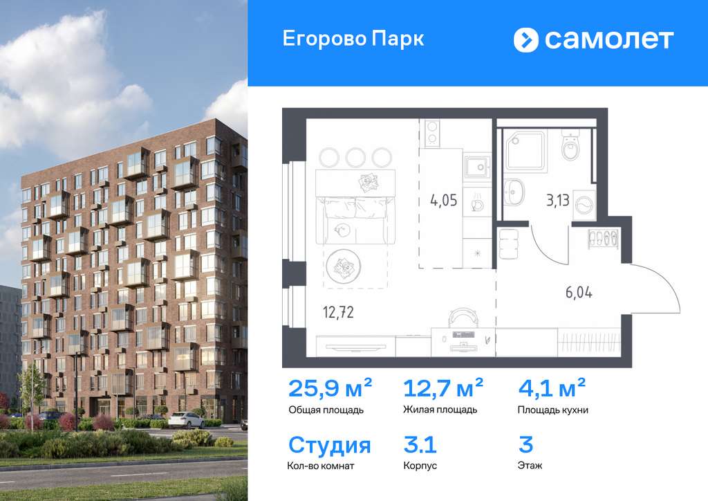 Строим кварталы для жизни с заботой о будущем. Предлагается квартира студия комфорт-класса 25,94 кв. м в корпусе 3.1 на 3 этаже, в ЖК «Егорово Парк»