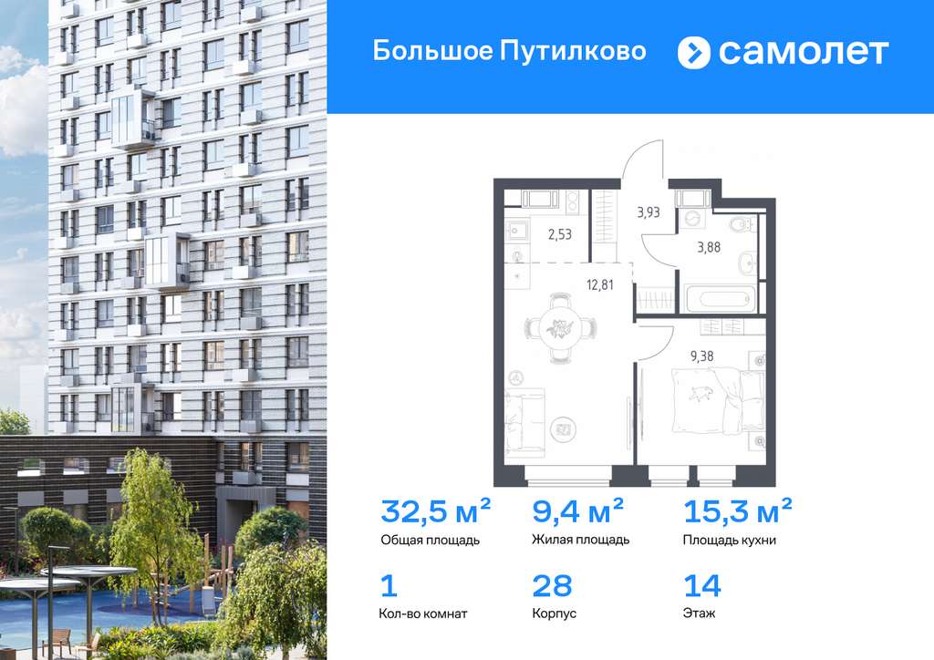 Строим кварталы для жизни с заботой о будущем. Предлагается 1-комнатная квартира комфорт-класса 32,53 кв. м в корпусе 28 на 14 этаже, в ЖК «Большое Путилково»