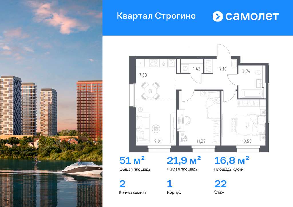 Строим кварталы для жизни с заботой о будущем. Предлагается 2-комнатная квартира комфорт-класса 51,02 кв. м в корпусе 1 на 22 этаже, в ЖК «Квартал Строгино»