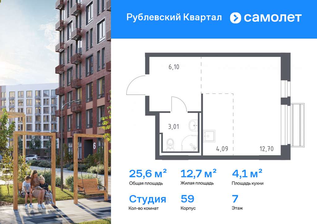 Строим кварталы для жизни с заботой о будущем. Предлагается квартира студия комфорт-класса 25,6 кв. м в корпусе 59 на 7 этаже, в ЖК «Рублевский Квартал»