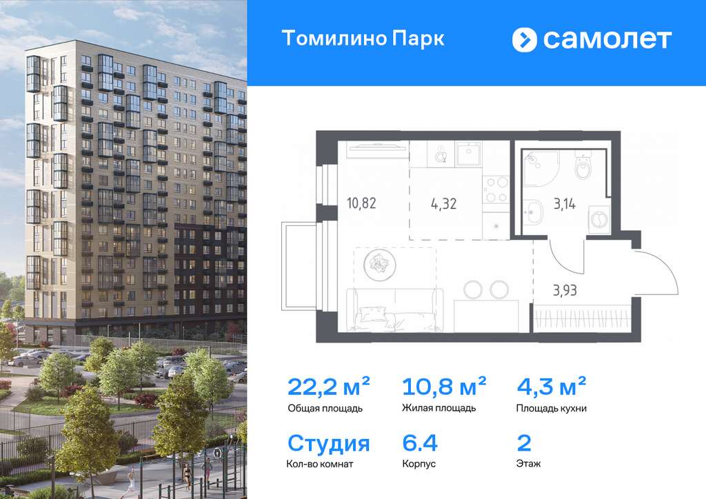Строим кварталы для жизни с заботой о будущем. Предлагается квартира студия комфорт-класса 22,21 кв. м в корпусе 6.4 на 2 этаже, в ЖК «Томилино Парк»