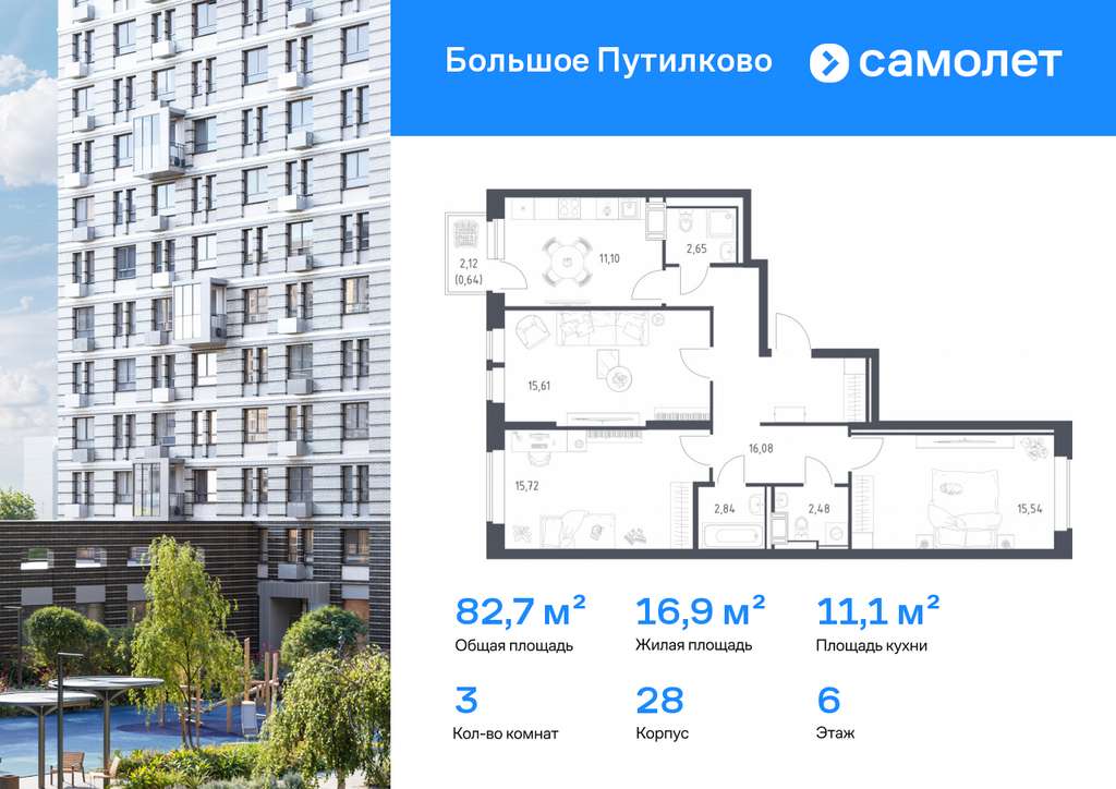 Строим кварталы для жизни с заботой о будущем. Предлагается 3-комнатная квартира комфорт-класса 82,66 кв. м в корпусе 28 на 6 этаже, в ЖК «Большое Путилково»