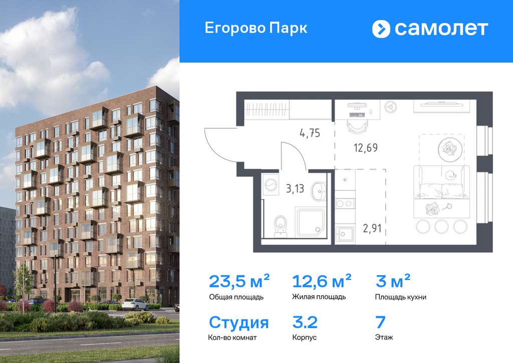 Строим кварталы для жизни с заботой о будущем. Предлагается квартира студия комфорт-класса 23,48 кв. м в корпусе 3.2 на 7 этаже, в ЖК «Егорово Парк»