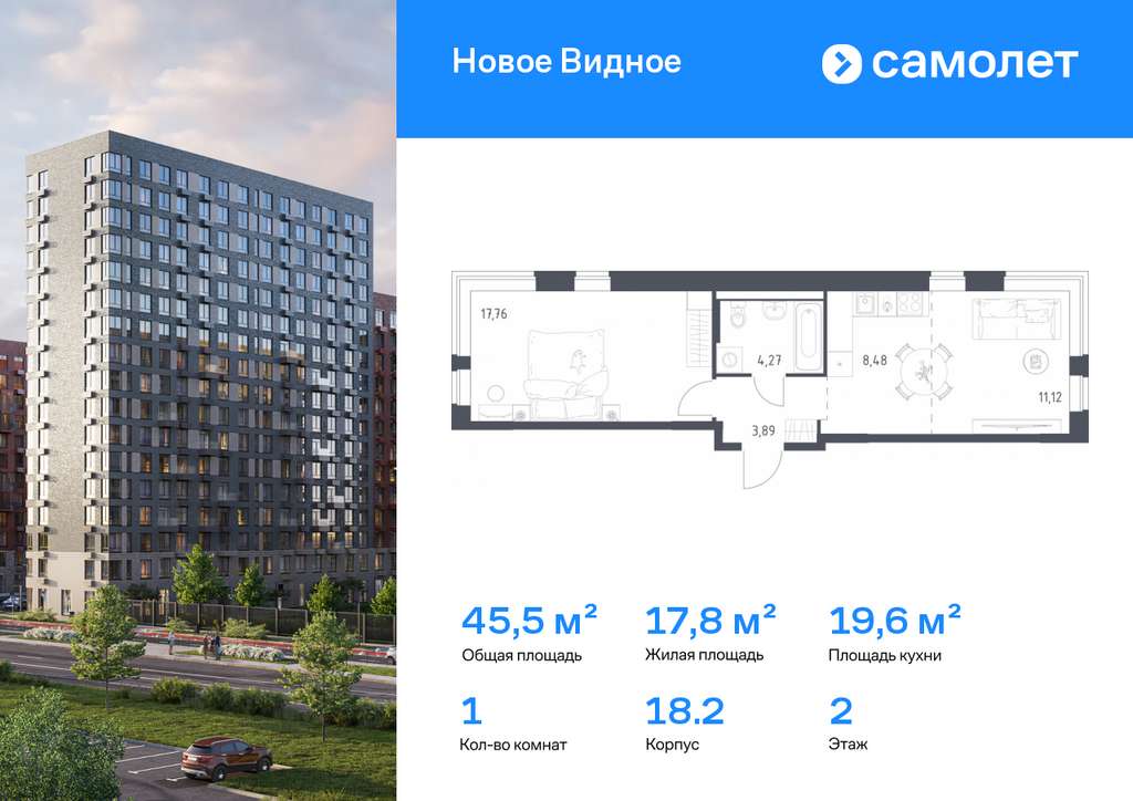 Строим кварталы для жизни с заботой о будущем. Предлагается 1-комнатная квартира комфорт-класса 45,52 кв. м в корпусе 18.2 на 2 этаже, в ЖК «Новое Видное»