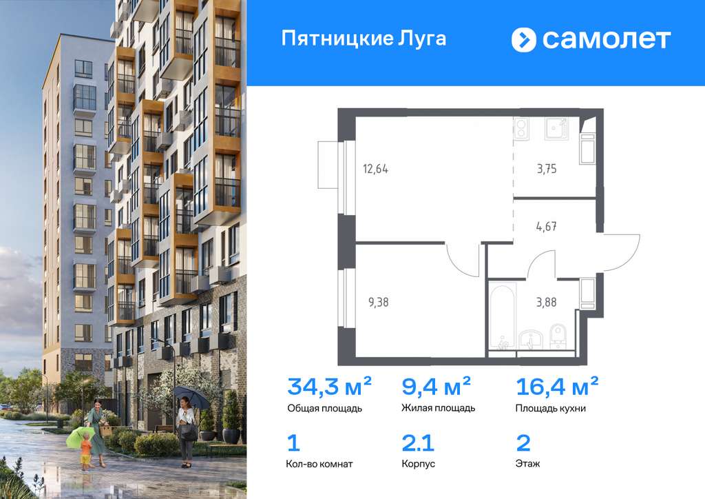 Строим кварталы для жизни с заботой о будущем. Предлагается 1-комнатная квартира комфорт-класса 34,32 кв. м в корпусе 2.1 на 2 этаже, в ЖК «Пятницкие Луга»