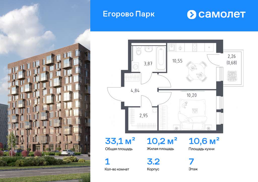 Строим кварталы для жизни с заботой о будущем. Предлагается 1-комнатная квартира комфорт-класса 33,09 кв. м в корпусе 3.2 на 7 этаже, в ЖК «Егорово Парк»