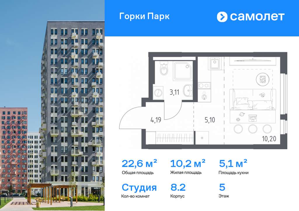 Строим кварталы для жизни с заботой о будущем. Предлагается квартира студия комфорт-класса 22,6 кв. м в корпусе 8.2 на 5 этаже, в ЖК «Горки Парк» Квартира с чистовой отделкой. Доступность дополнительных опций уточняйте у застройщика. Приобрести квартиру возможно по специальным акциям от застройщика, с текущими условиями акций можно ознакомиться в блоке «Акций». Цена динамическая и может отличаться, уточняйте актуальность у застройщика. Уединенный жилой комплекс, где хочется остаться. До МКАДа всего 10 минут на авто, а прямо рядом с домами есть лес — идеально для прогулок, занятий спортом и медитаций. Фасады 11–17-этажных корпусов дополняют яркие вставки — каждый дом особенный. На территории проекта появятся ФОК и поликлиника, детские сады и школы. Наслаждаться счастливой жизнью в квартале можно уже сейчас — здесь есть готовые дома, но при этом появляются и новые корпуса. «Горки Парк» — это: 1. 10 минут на машине до МКАДа 2. 20 минут на машине до метро «Домодедовская» и 18 минут — до аэропорта Домодедово 3. Пешеходные бульвары и пространства для отдыха 4. Выход в лесопарк с благоустроенными экотропами 5. Приватные дворы без машин 6. Экомаршрут в Коробовском лесопарке рядом с домом, который соединит кварталы: «Пригород Лесное», «Горки Парк» и «Богдановский Лес» 7. Запланировано 3 школы и 6 детских садов 8. Уже построили детский сад и школу со спортивным ядром, где смогут тренироваться жители квартала 9. Поликлиника и спорткомплекс внутри проекта 10. Магазины и кофейни на первых этажах 11. Игровые площадки и воркаут-зона 12. Прогулочная зона рядом с кварталом 13. Спортивно-игровой кластер 14. Площадки для занятий йогой и игры в пинг-понг — в части дворов 15. Рабочий остров и площадка для отдыха — в части дворов 16. Веревочный панда-парк — в будущем 17. Площадка для выгула собак 18. Балконы с панорамным остеклением 19. Увеличенные окна в квартирах 20. Входы на уровне земли 21. Места для хранения велосипедов и колясок