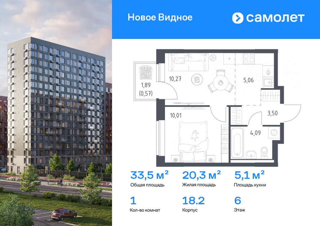 Строим кварталы для жизни с заботой о будущем. Предлагается 1-комнатная квартира комфорт-класса 33,5 кв. м в корпусе 18.2 на 6 этаже, в ЖК «Новое Видное»
