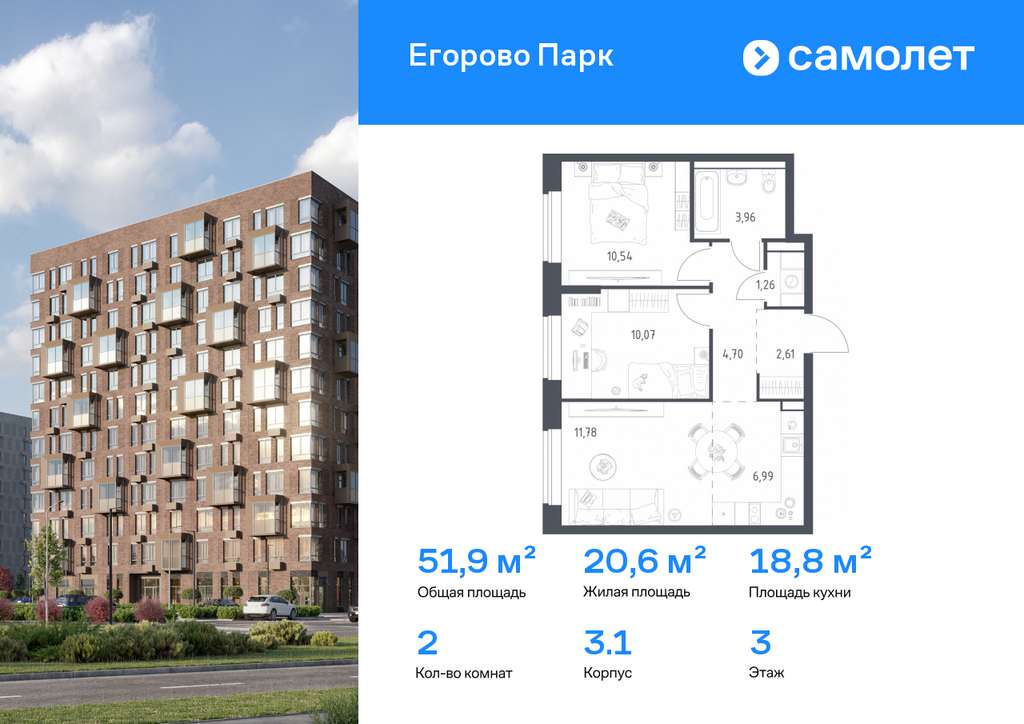 Строим кварталы для жизни с заботой о будущем. Предлагается 2-комнатная квартира комфорт-класса 51,91 кв. м в корпусе 3.1 на 3 этаже, в ЖК «Егорово Парк»