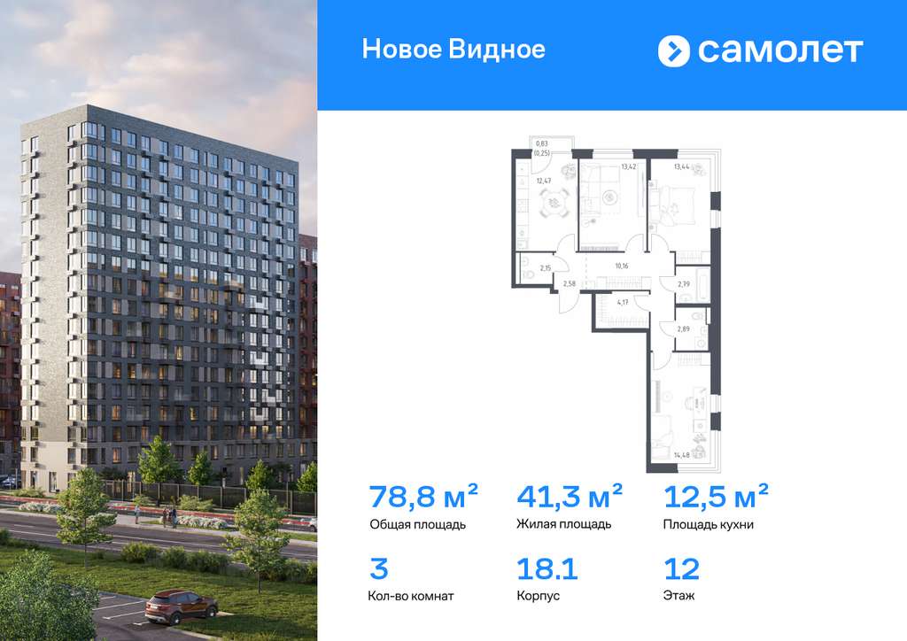 Строим кварталы для жизни с заботой о будущем. Предлагается 3-комнатная квартира комфорт-класса 78,8 кв. м в корпусе 18.1 на 12 этаже, в ЖК «Новое Видное»
