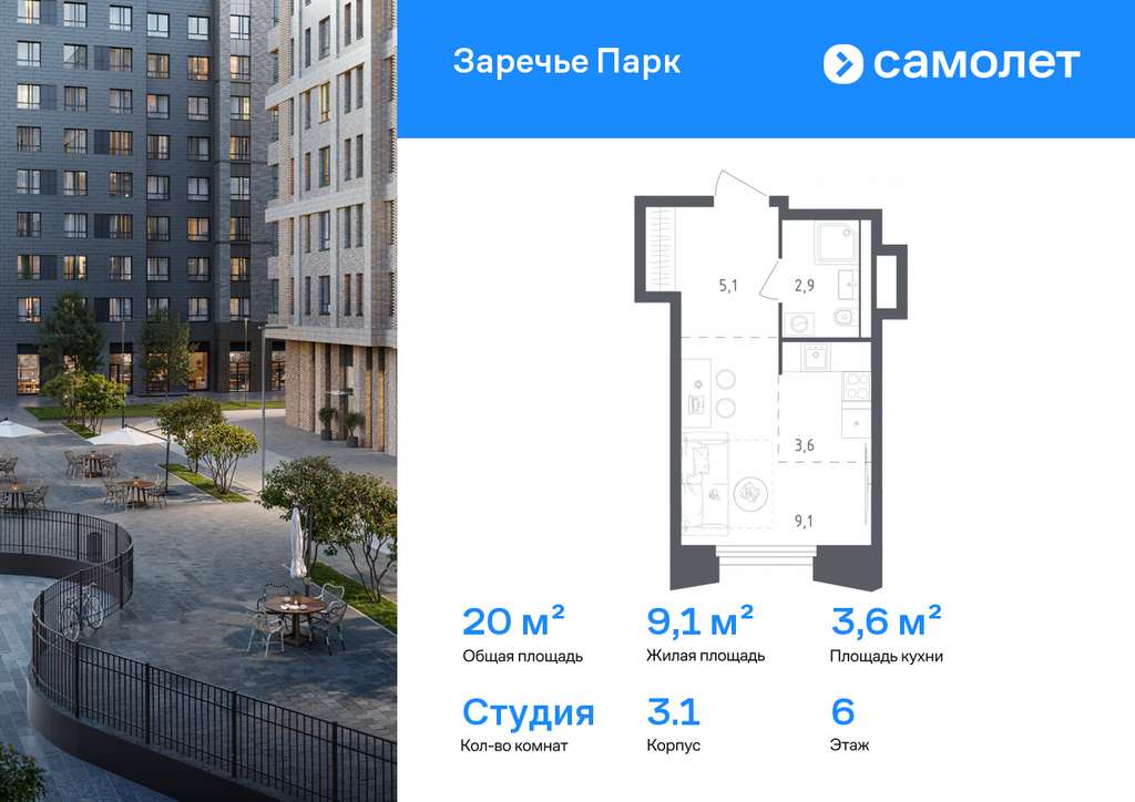 Строим кварталы для жизни с заботой о будущем. Предлагается квартира студия бизнес-класса 20 кв. м в корпусе 3.1 на 6 этаже, в ЖК «Заречье Парк»