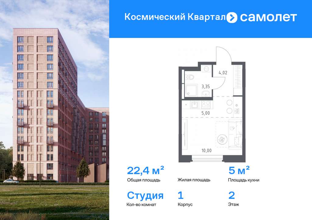 Строим кварталы для жизни с заботой о будущем. Предлагается квартира студия комфорт-класса 22,37 кв. м в корпусе 1 на 2 этаже, в ЖК «Космический Квартал»