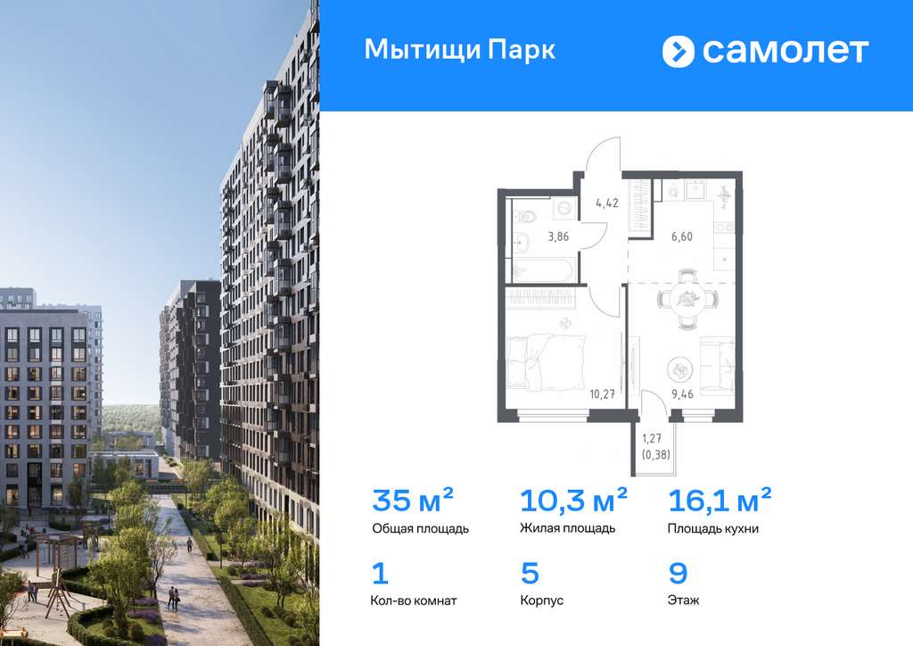 Строим кварталы для жизни с заботой о будущем. Предлагается 1-комнатная квартира комфорт-класса 34,99 кв. м в корпусе 5 на 9 этаже, в ЖК «Мытищи Парк»