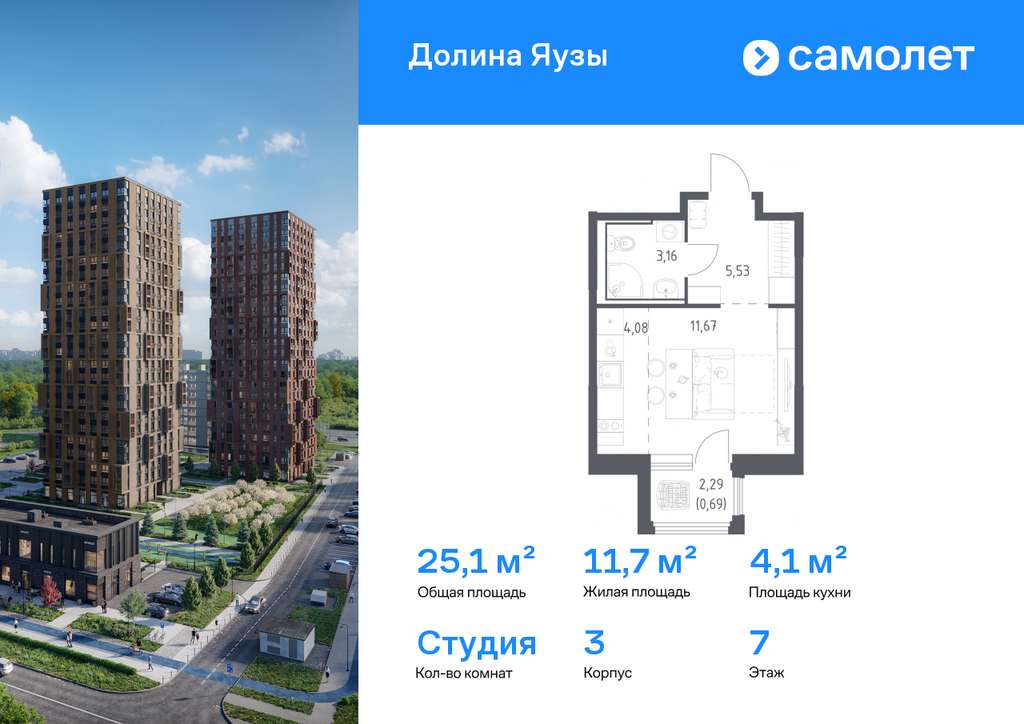 Строим кварталы для жизни с заботой о будущем. Предлагается квартира студия комфорт-класса 25,13 кв. м в корпусе 3 на 7 этаже, в ЖК «Долина Яузы»