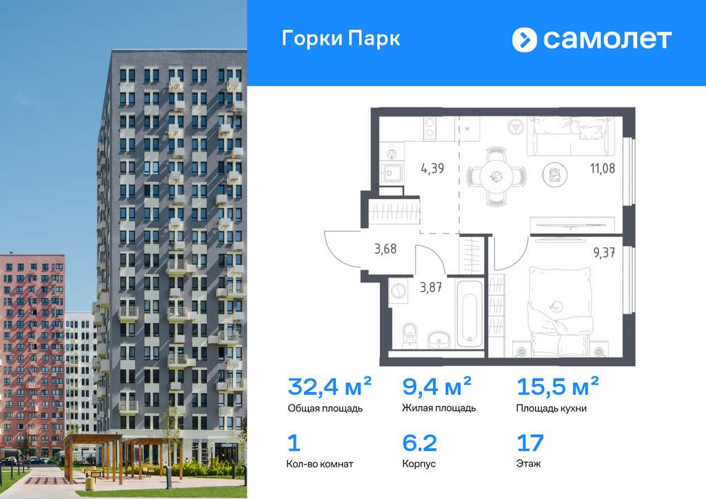 Строим кварталы для жизни с заботой о будущем. Предлагается 1-комнатная квартира комфорт-класса 32,39 кв. м в корпусе 6.2 на 17 этаже, в ЖК «Горки Парк»