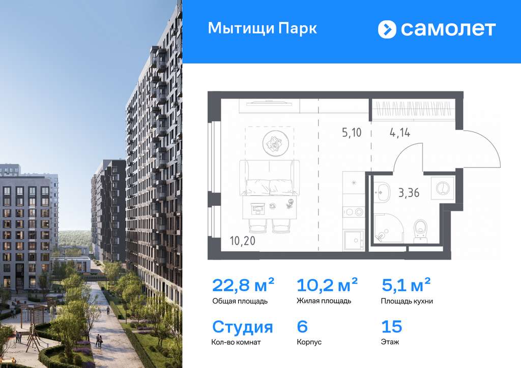 Строим кварталы для жизни с заботой о будущем. Предлагается квартира студия комфорт-класса 22,8 кв. м в корпусе 6 на 15 этаже, в ЖК «Мытищи Парк»