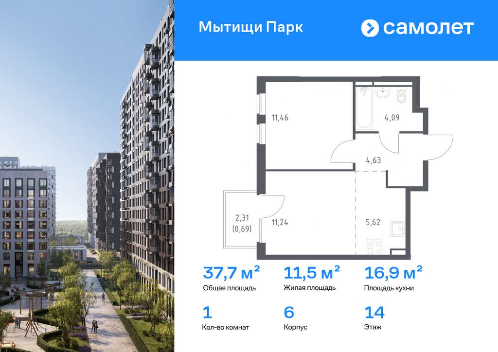 Строим кварталы для жизни с заботой о будущем. Предлагается 1-комнатная квартира комфорт-класса 37,73 кв. м в корпусе 6 на 14 этаже, в ЖК «Мытищи Парк»