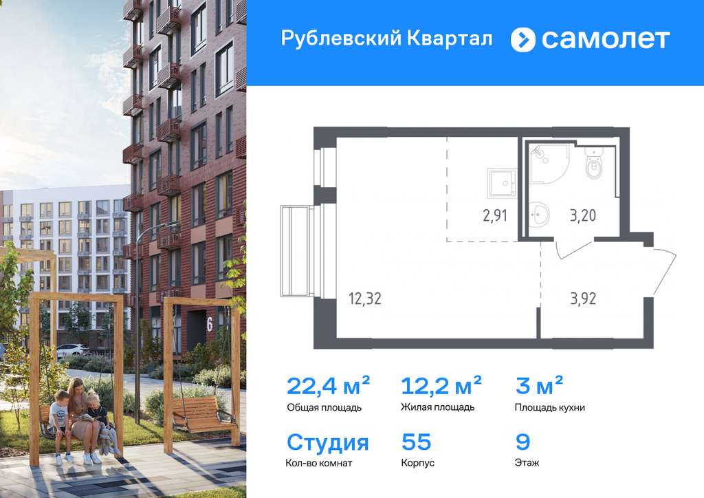 Строим кварталы для жизни с заботой о будущем. Предлагается квартира студия комфорт-класса 22,35 кв. м в корпусе 55 на 9 этаже, в ЖК «Рублевский Квартал»