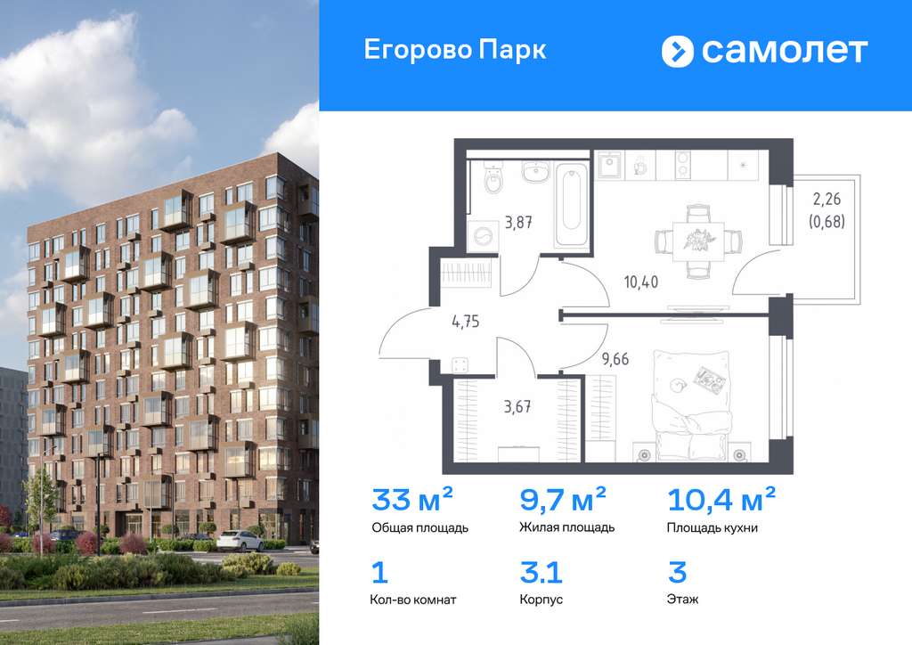 Строим кварталы для жизни с заботой о будущем. Предлагается 1-комнатная квартира комфорт-класса 33,03 кв. м в корпусе 3.1 на 3 этаже, в ЖК «Егорово Парк»