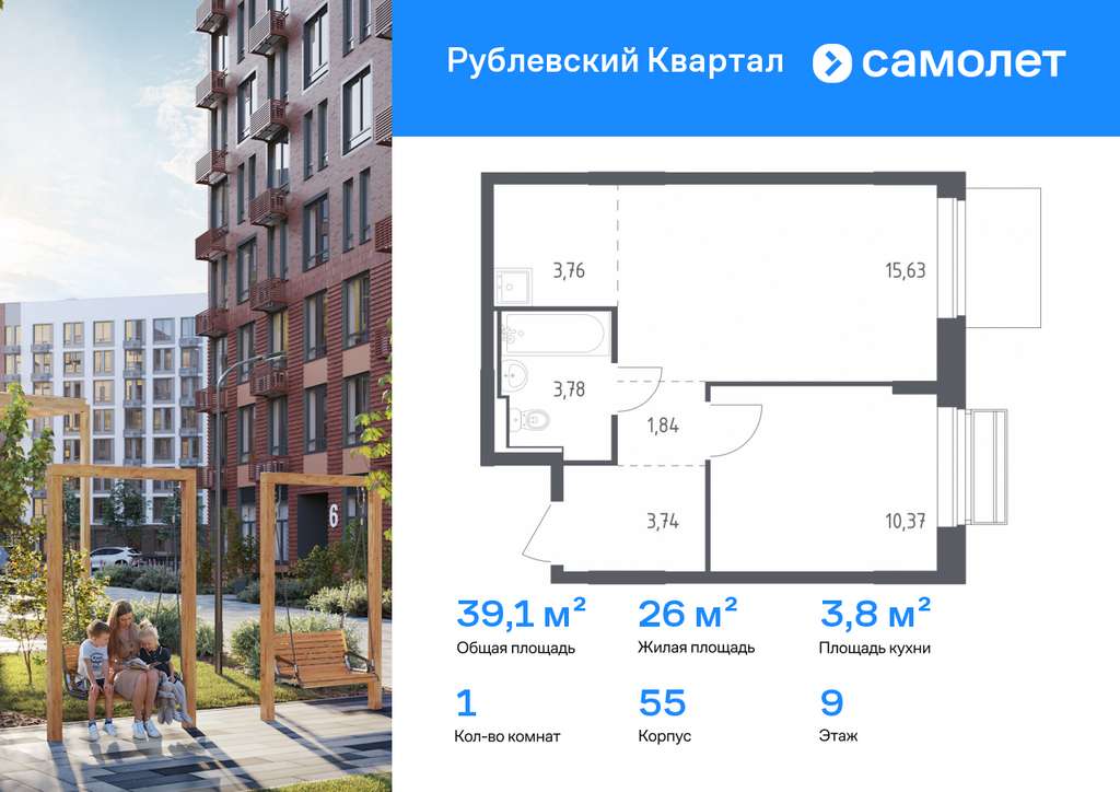 Строим кварталы для жизни с заботой о будущем. Предлагается 1-комнатная квартира комфорт-класса 39,12 кв. м в корпусе 55 на 9 этаже, в ЖК «Рублевский Квартал»