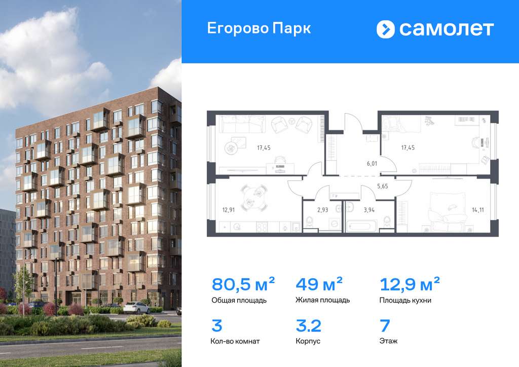 Строим кварталы для жизни с заботой о будущем. Предлагается 3-комнатная квартира комфорт-класса 80,45 кв. м в корпусе 3.2 на 7 этаже, в ЖК «Егорово Парк»