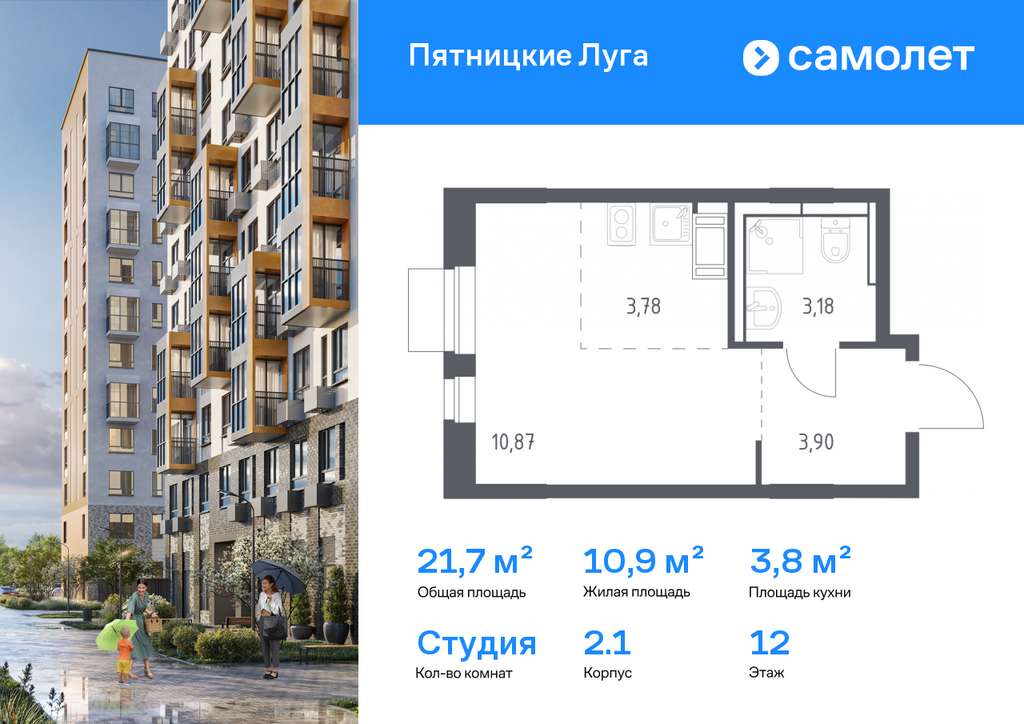 Строим кварталы для жизни с заботой о будущем. Предлагается квартира студия комфорт-класса 21,73 кв. м в корпусе 2.1 на 12 этаже, в ЖК «Пятницкие Луга»