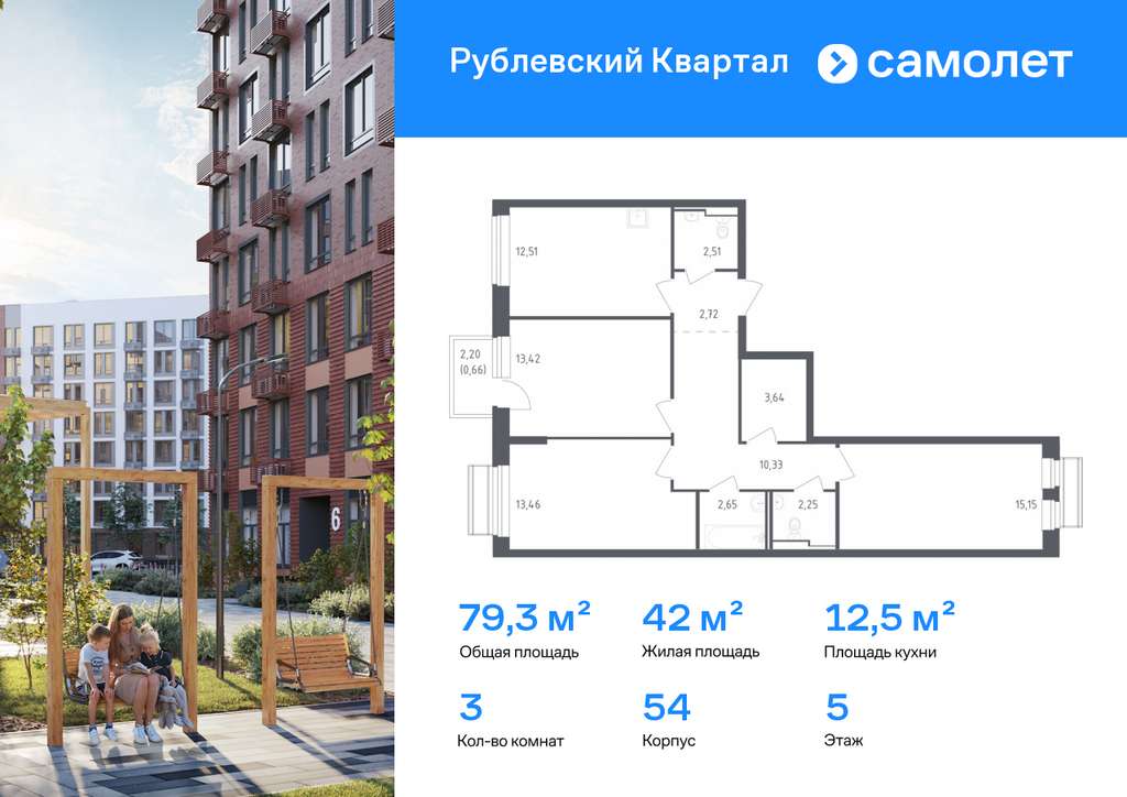 Строим кварталы для жизни с заботой о будущем. Предлагается 3-комнатная квартира комфорт-класса 79,3 кв. м в корпусе 54 на 5 этаже, в ЖК «Рублевский Квартал»