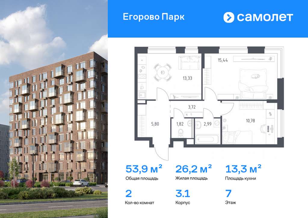 Строим кварталы для жизни с заботой о будущем. Предлагается 2-комнатная квартира комфорт-класса 53,88 кв. м в корпусе 3.1 на 7 этаже, в ЖК «Егорово Парк»