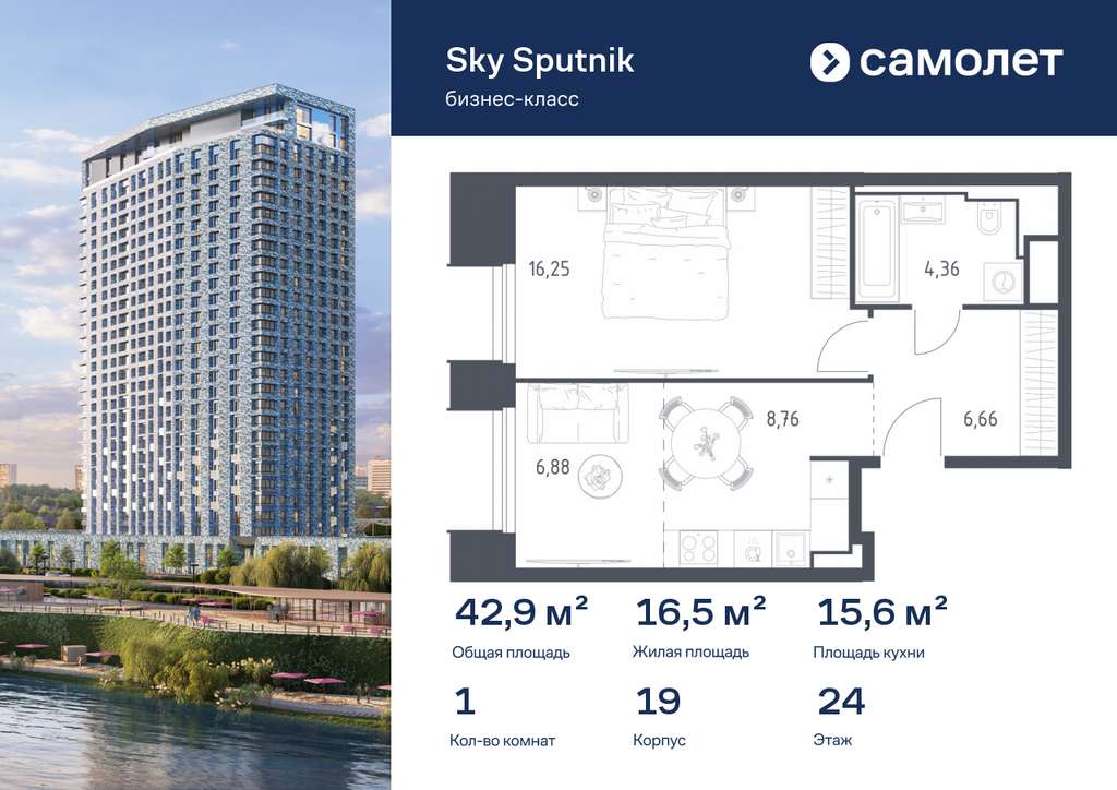 Строим кварталы для жизни с заботой о будущем. Предлагаются 1-комнатные апартаменты бизнес-класса 42,91 кв. м в корпусе 19 на 24 этаже, в Sky Sputnik