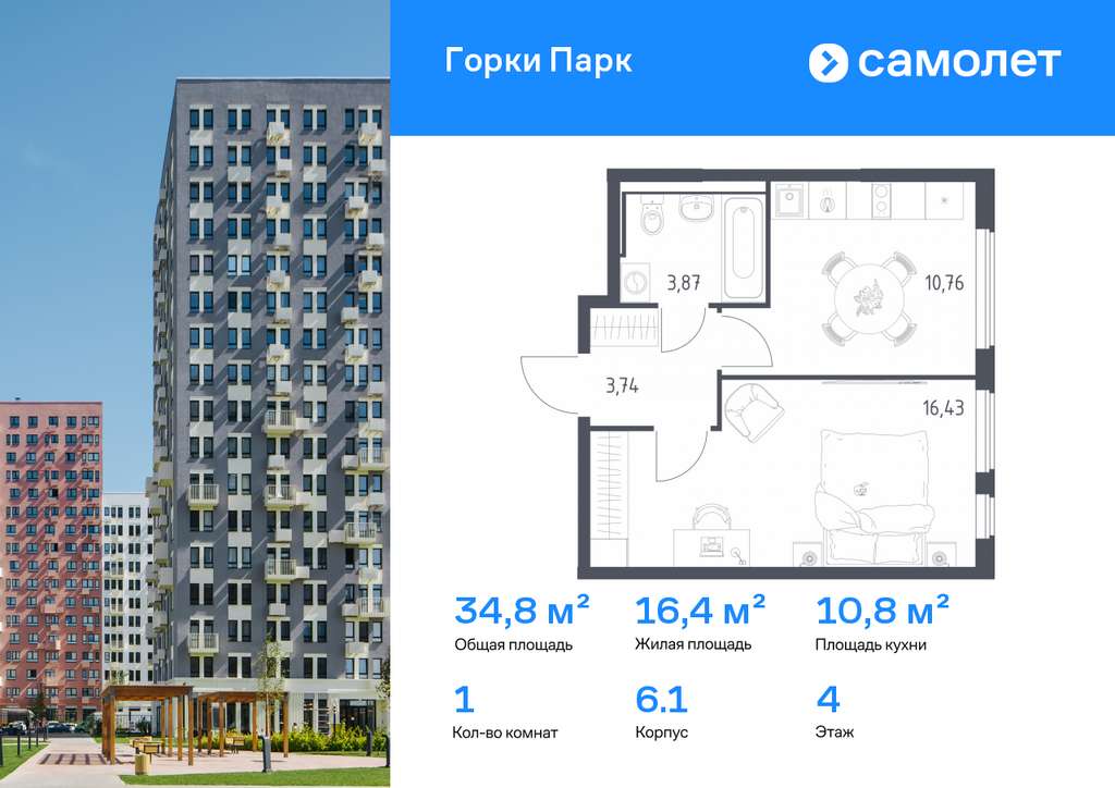 Строим кварталы для жизни с заботой о будущем. Предлагается 1-комнатная квартира комфорт-класса 34,8 кв. м в корпусе 6.1 на 4 этаже, в ЖК «Горки Парк»