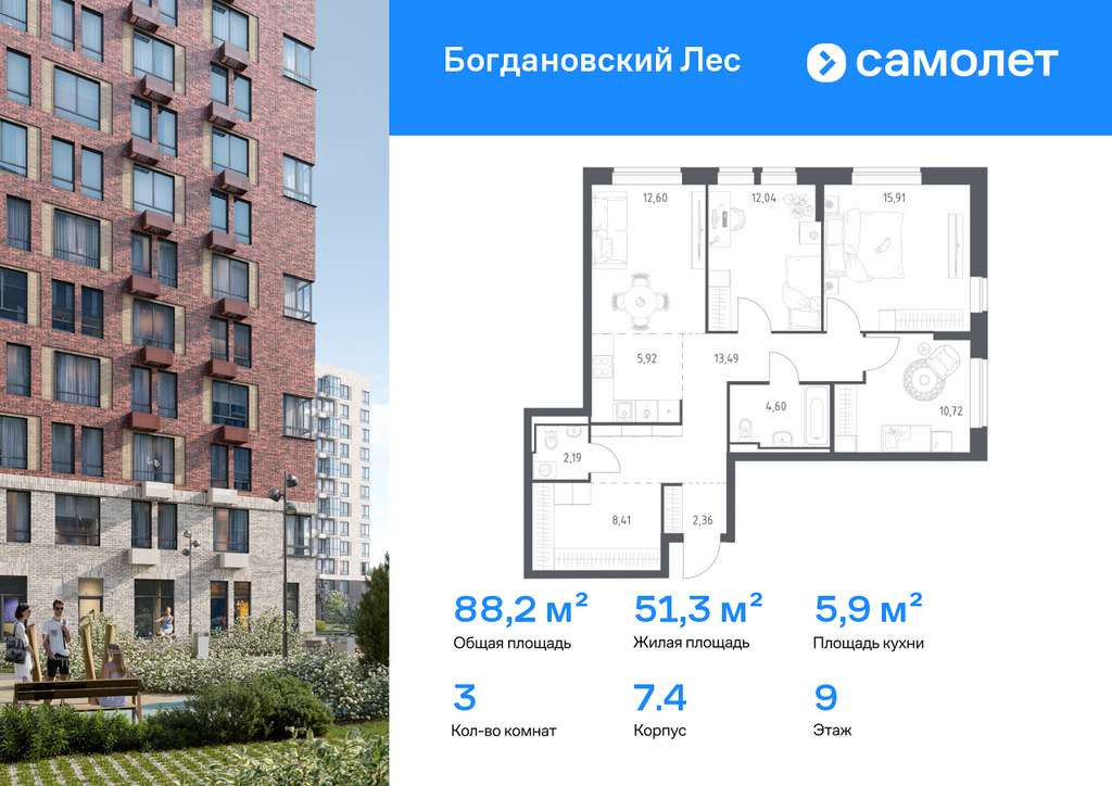 Строим кварталы для жизни с заботой о будущем. Предлагается 3-комнатная квартира комфорт-класса 88,24 кв. м в корпусе 7.4 на 9 этаже, в ЖК «Богдановский Лес»