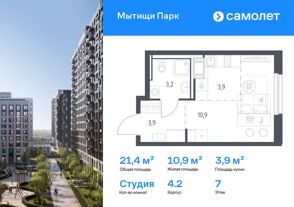 Строим кварталы для жизни с заботой о будущем. Предлагается квартира студия комфорт-класса 21,4 кв. м в корпусе 4.2 на 7 этаже, в ЖК «Мытищи Парк»