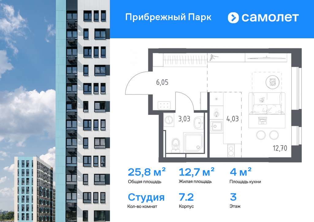 Строим кварталы для жизни с заботой о будущем. Предлагается квартира студия комфорт-класса 25,81 кв. м в корпусе 7.2 на 3 этаже, в ЖК «Прибрежный Парк»